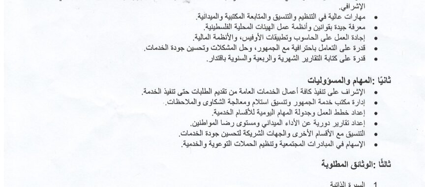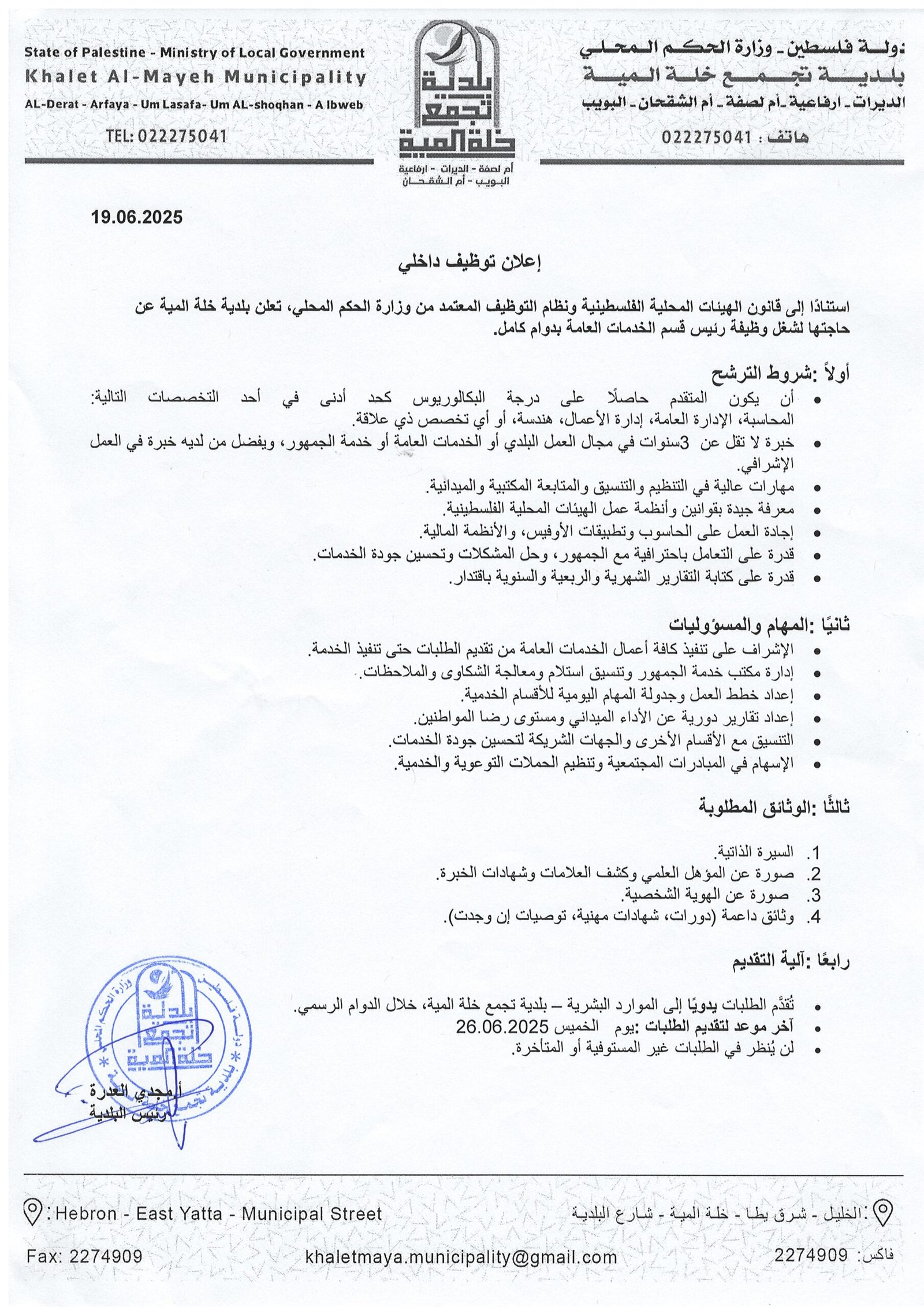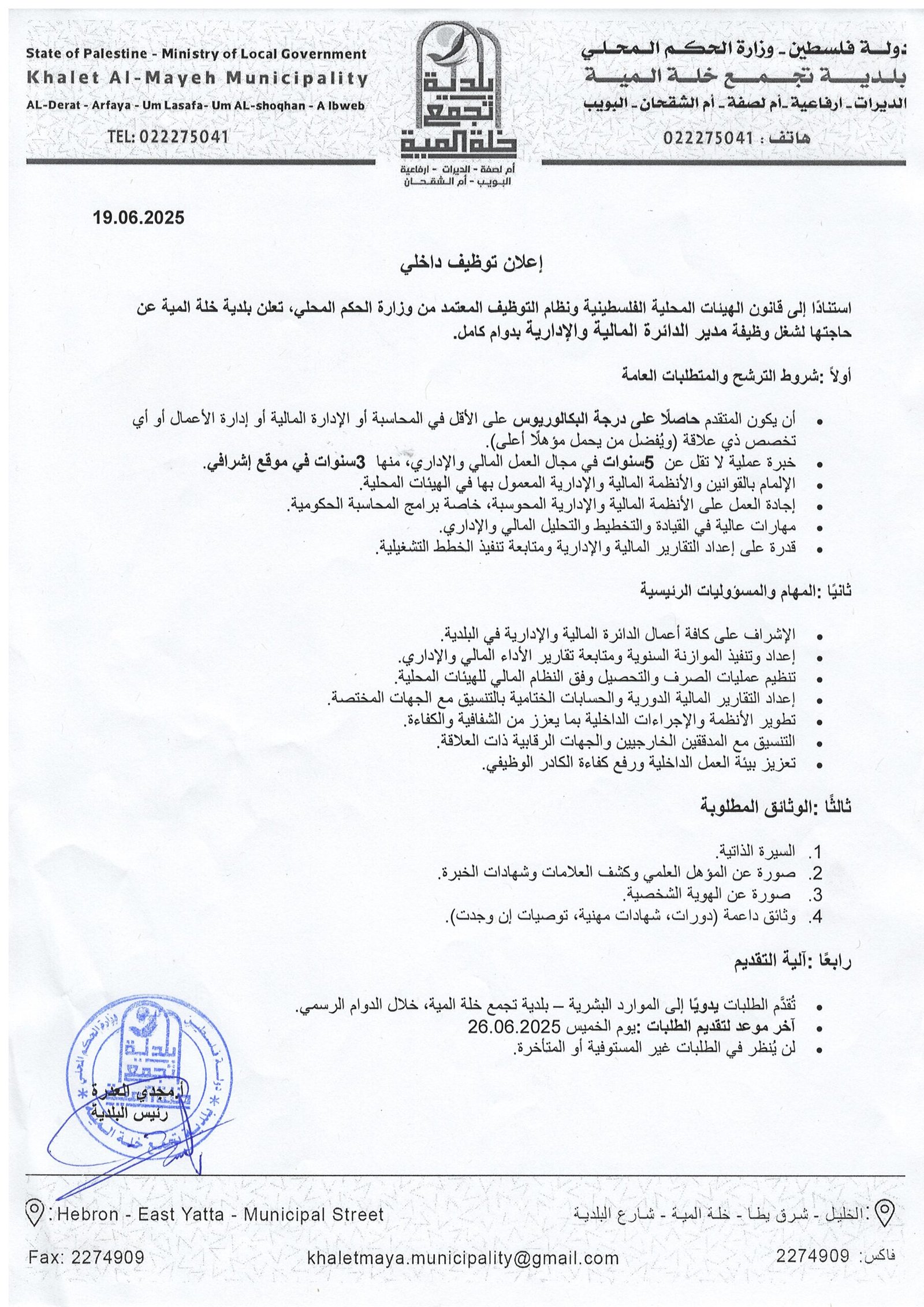 استنادًا إلى قانون الهيئات المحلية الفلسطينية ونظام التوظيف المعتمد من وزارة الحكم المحلي، تعلن بلدية خلة المية عن حاجتها لشغل وظيفة مدير الدائرة المالية والإدارية وشاغر رئيس قسم الخدمات العامة.
