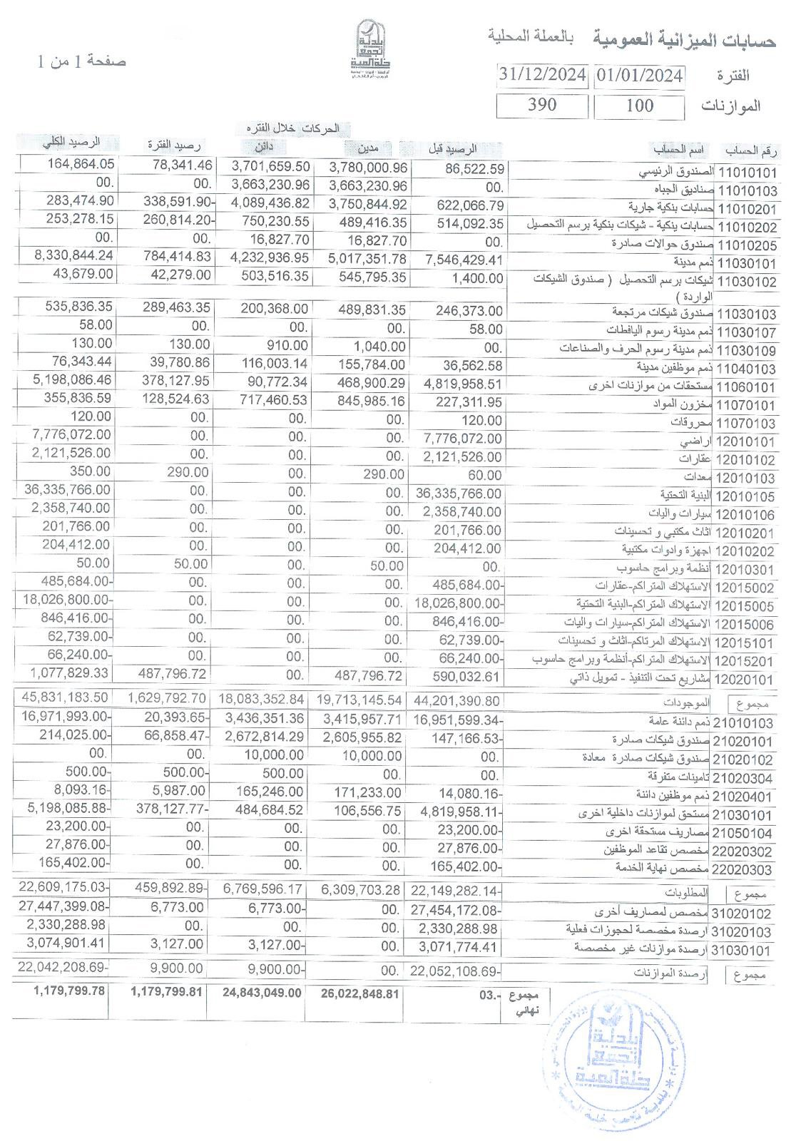 وقد تم عرض الميزانية الفعلية التي تتضمن الإيرادات والنفقات المحققة خلال العام 2024، بالإضافة إلى بيان المركز المالي للبلدية ومصادر التمويل، كما جرى نشر نسخة منها عبر اللوحة الإعلانية الرسمية في مبنى البلدية، وعبر القنوات الرقمية الرسمية.
